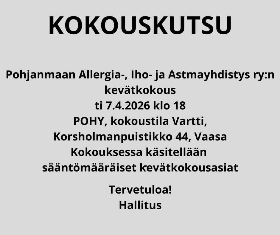 Meiltä saat tietoa ja vertaistukea allergiaan, iho-ongelmiin ja astmaan. Tule mukaan tapaamisiimme ja osallistu keskusteluun FB-ryhmässä!